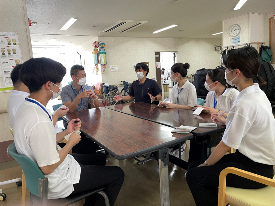 当日は、施設紹介のあと、作業療法士によるリハビリテーションの様子を見学。入所者の方々が日常生活動作やレクリエーション活動に取り組む姿を間近で見て、学生たちは真剣にメモを取りながら理解を深めていました。さらに、スタッフの方々と直接話をする機会もあり、教科書だけでは得られないリアルな知識を吸収しました。
