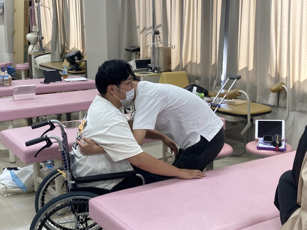 理学療法学専攻3年生の授業の中で、理学療法総合演習があります。この授業では実際の患者様を想定して、車いすからベッドへの乗り移る介助や、理学療法士が行う検査・測定の技術の練習を行っています。