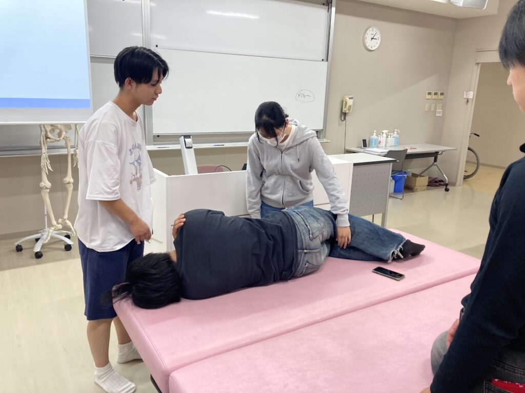 今回は、患者様の筋力を調べる「MMT(徒手筋力テスト)」の実技を行いました。学生たちは、実際の患者様を想定して、声かけや力の入れ方などにも気を配りながら、真剣に演習を行っていました。